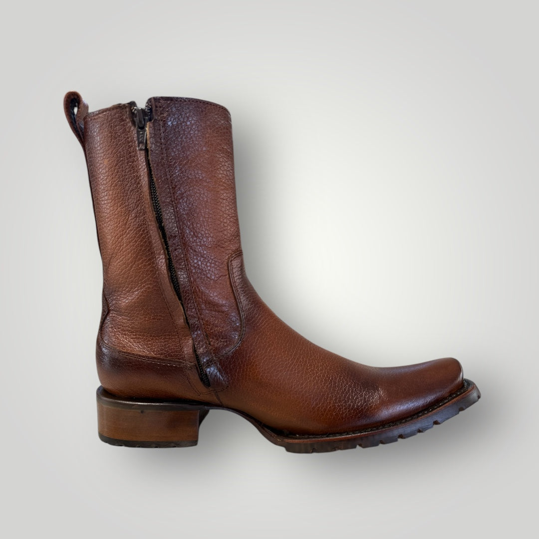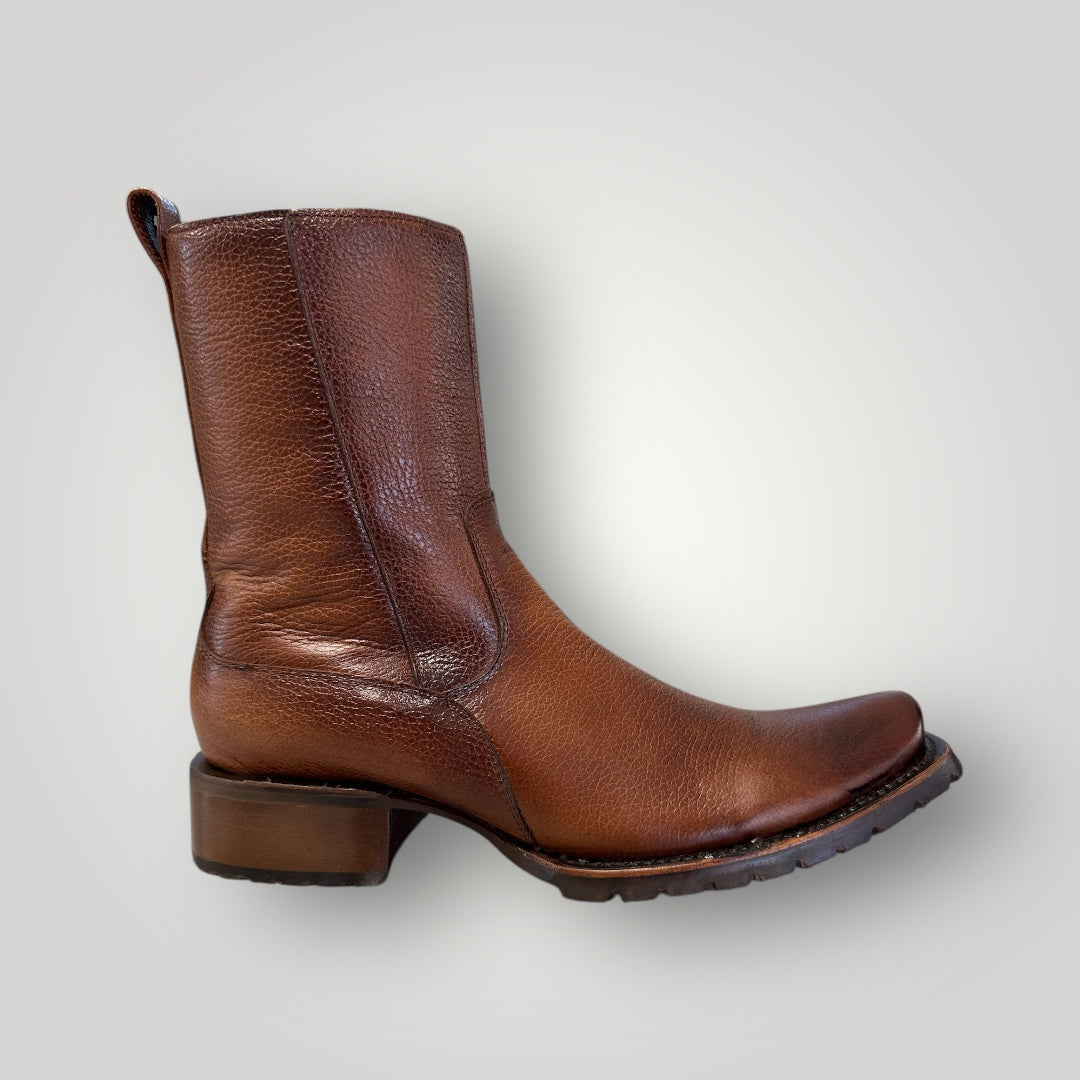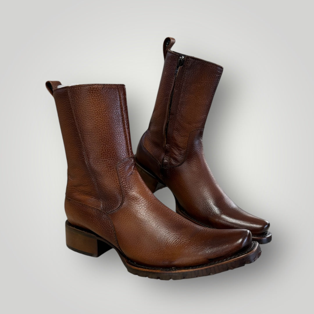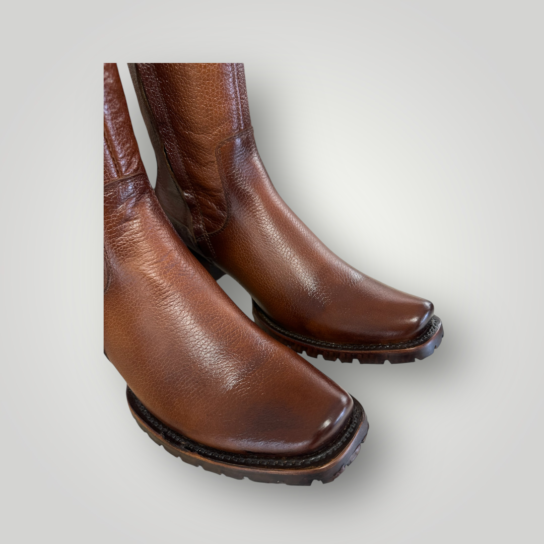 Esta bota esta hecha de piel de res en un hermoso tono brandy , que le da un aspecto elegante y sofisticado. La suela , fabricada con un material resistente similar al de los neumáticos de camión , ofrece una excelente tracción y durabilidad , lo que la hace ideal para terrenos difíciles.