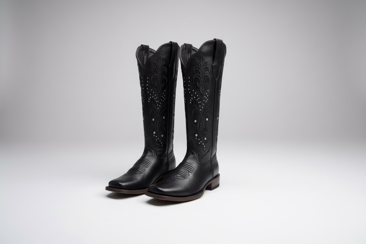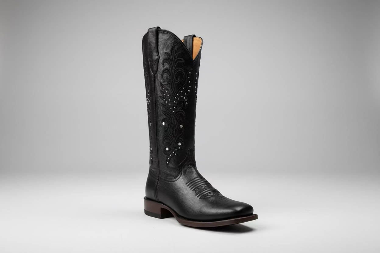 Bota cuadrada en negro con detalles de pedrería y estoperoles que añaden un toque de brillo y personalidad. Diseño clásico con puntera cuadrada y altura que llega a media pantorrilla, perfecta para crear looks versátiles. Los adornos decorativos le dan un acabado sofisticado y llamativo. Ideal para quienes buscan una bota con carácter que combine comodidad y estilo en cualquier ocasión.