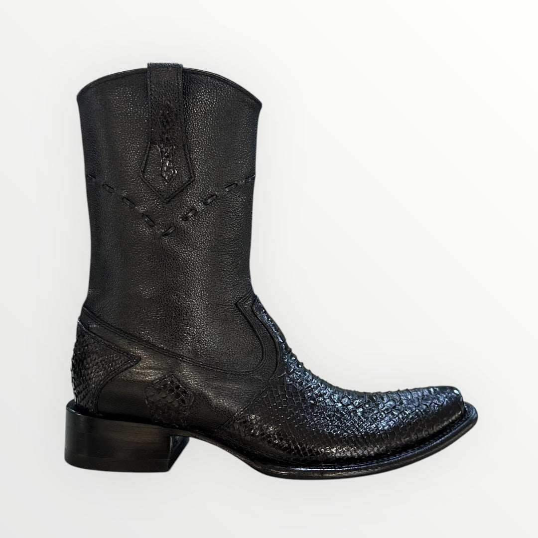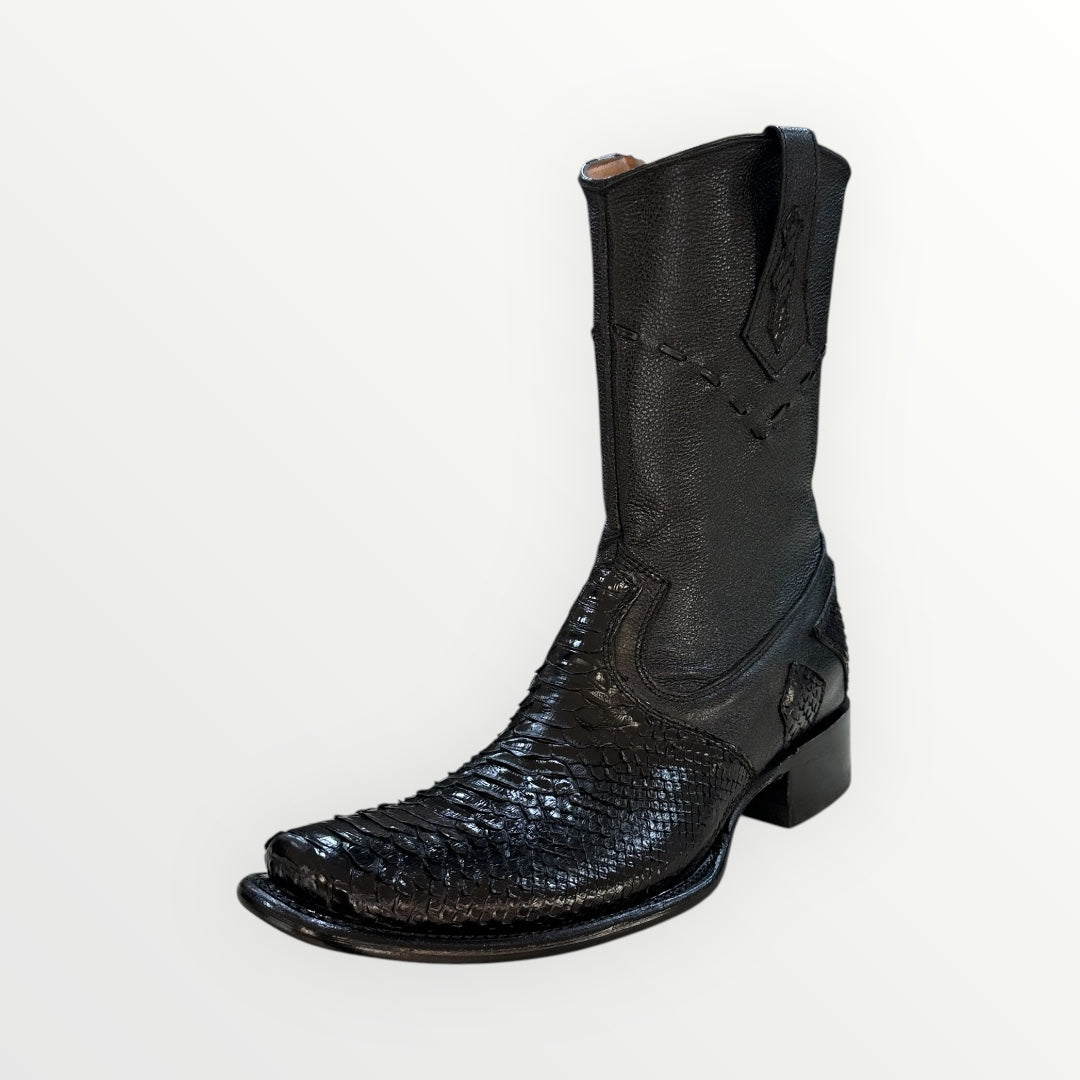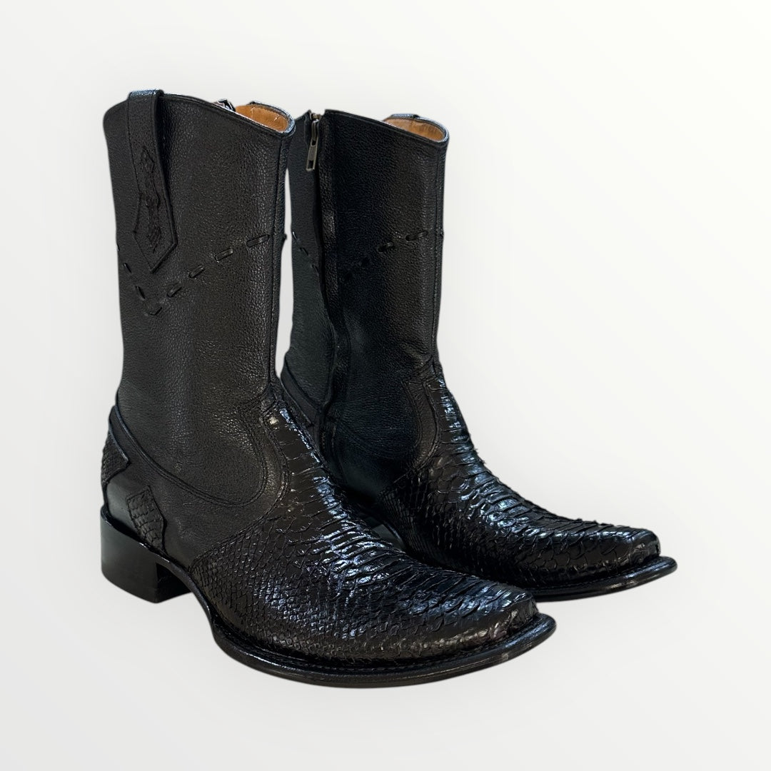 La oscuridad y la elegancia se fusionan en nuestras botas 'Pitón Negro'. Hechas con piel de víbora de pitón auténtica y seleccionada, estas botas son una obra maestra de la artesanía y el diseño. La textura suave y la escala única del pitón dan a estas botas un look exótico y sofisticado. La piel negra como el ébano y los detalles sutiles de la escama crean un efecto visual impresionante. Diseñadas para aquellos que buscan algo verdaderamente único y exclusivo, nuestras botas de pitón son perfectas para hacer una declaración en cualquier ocasión."